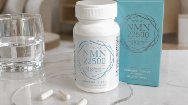 NMN22500+48は純度99.99%以上のβ-NMNを22,500mg配合し、48種の美容・健康素材を追加配合したトータルサポートで毎日の若々しさを応援します。